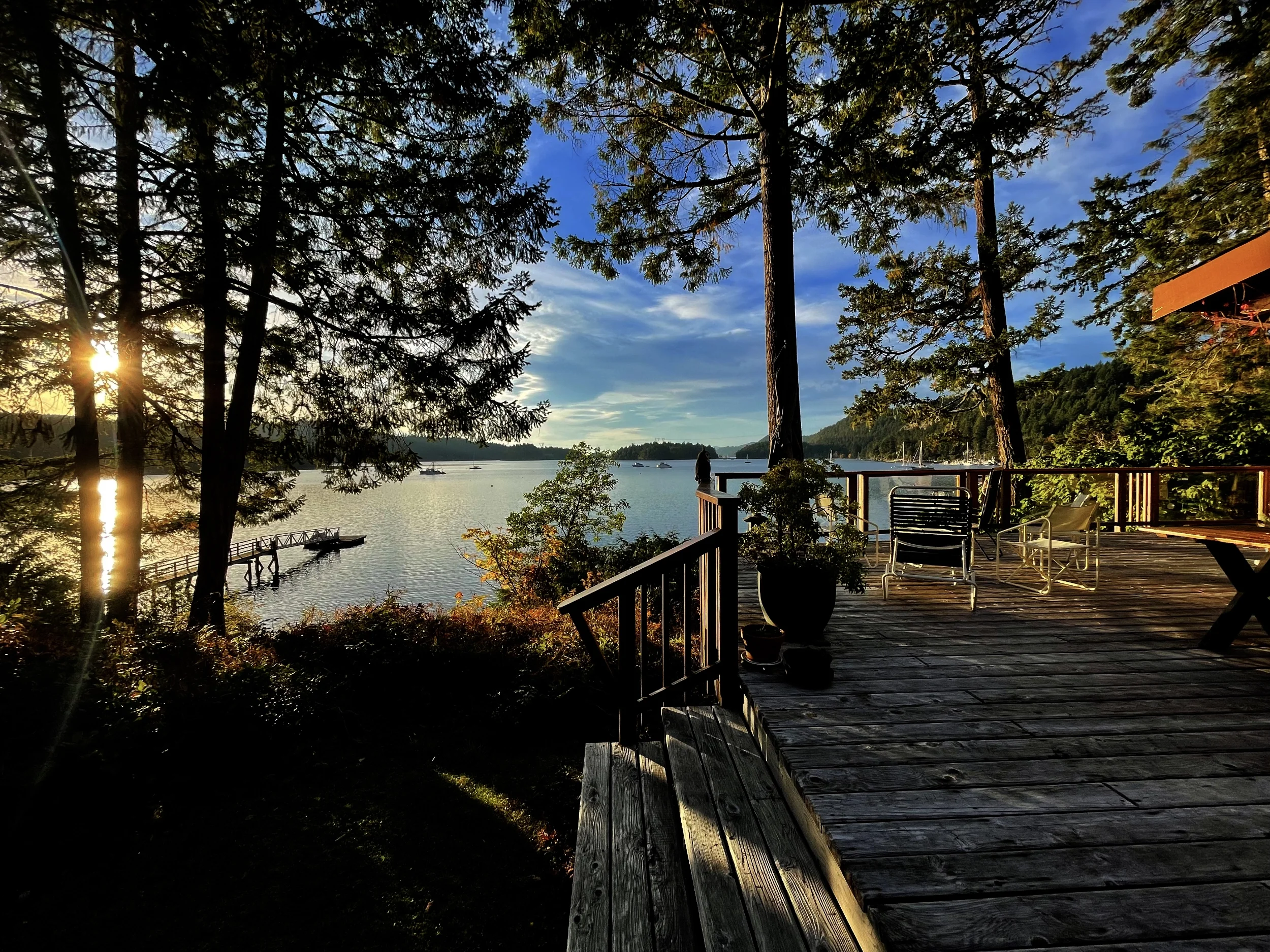 A view of a lakeside deck surrounded by tall trees, with a dock extending into the water, boats on the lake, and a partly cloudy sky during sunset or sunrise.