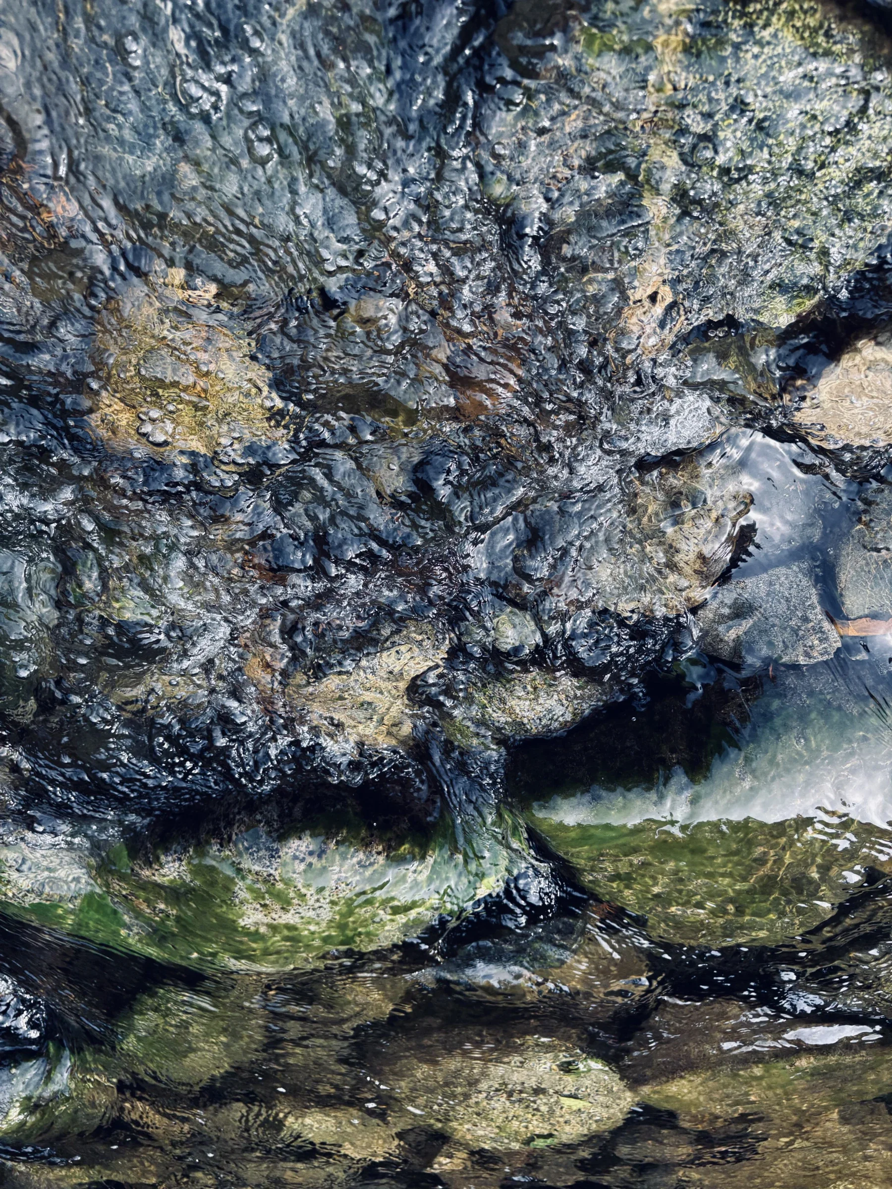 Close-up of water flowing over rocks in a stream or river, with splashes and ripples.