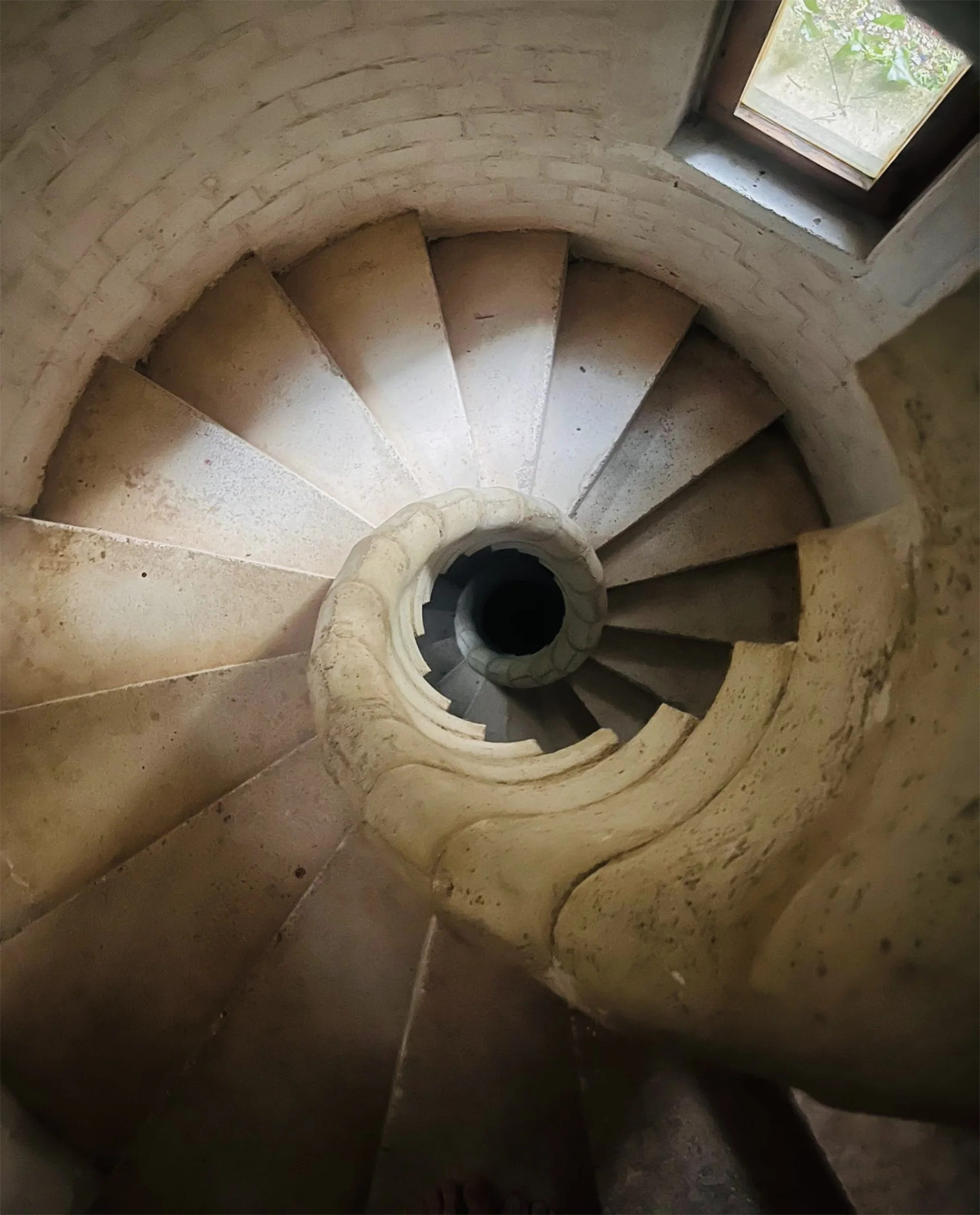 View from the top of a spiral staircase looking downward, showing the steps curving around a central hollow and a small window at the top letting in natural light.