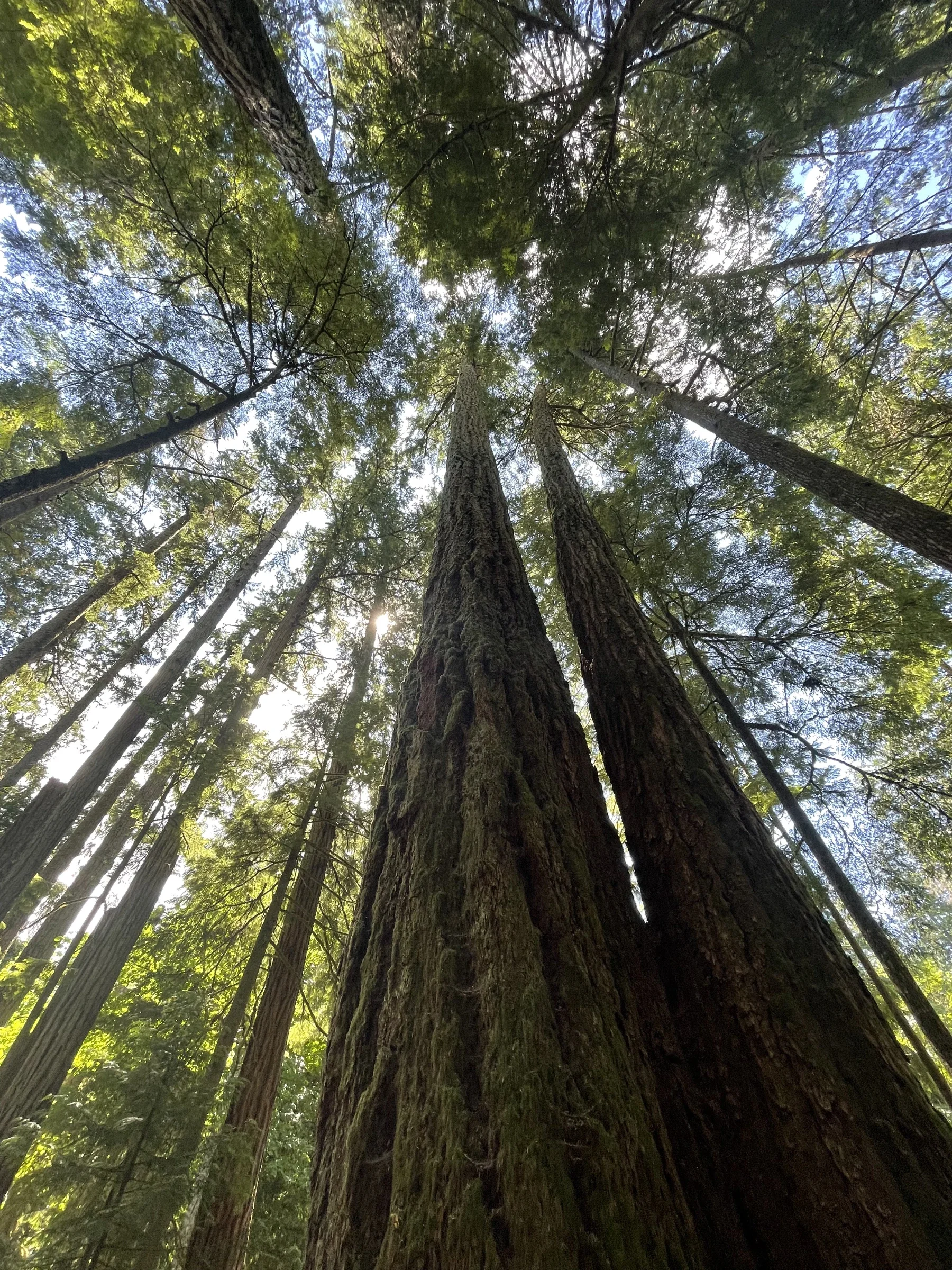 Looking up at tall trees in a green forest with sunlight filtering through the leaves.